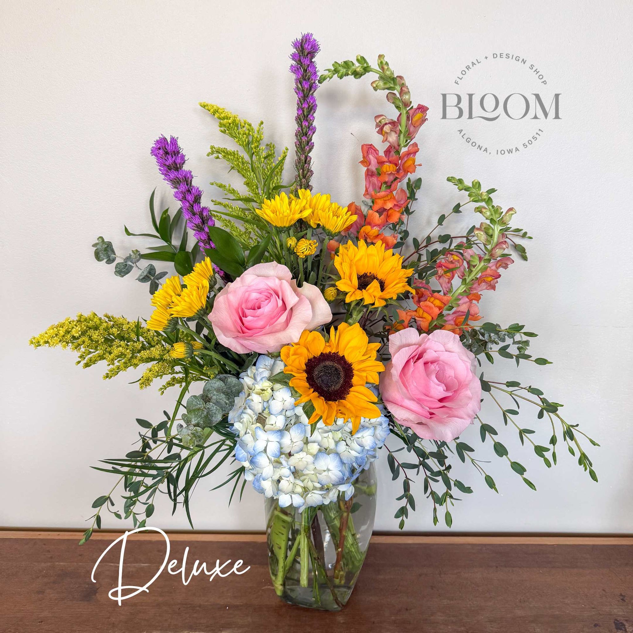 Our mix of wildflowers is as sweet as a warm breeze and will surely brighten up any room. Featuring a variety of bright flowers including hydrangea, lilies, sunflowers, liatris or snapdragons, daisy poms, and asters - this bouquet is sure to impress.