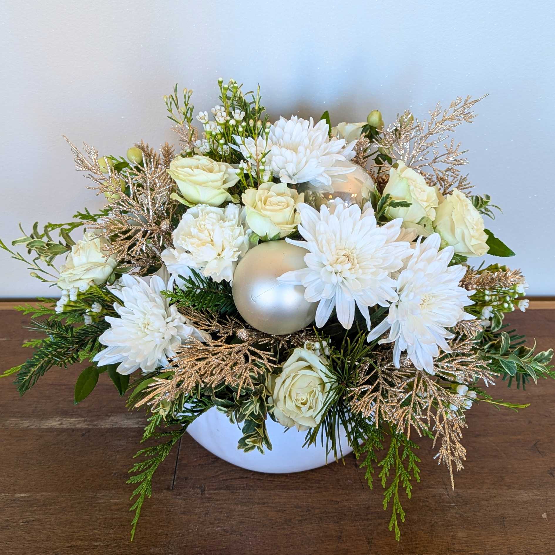 A beautiful ceramic serving bowl overflows with fresh evergreen, champagne-toned seasonal accents and a mix of white blooms like mums and carnations and mini roses. This wintery centerpiece is the perfect size for a smaller sized dining or end table.