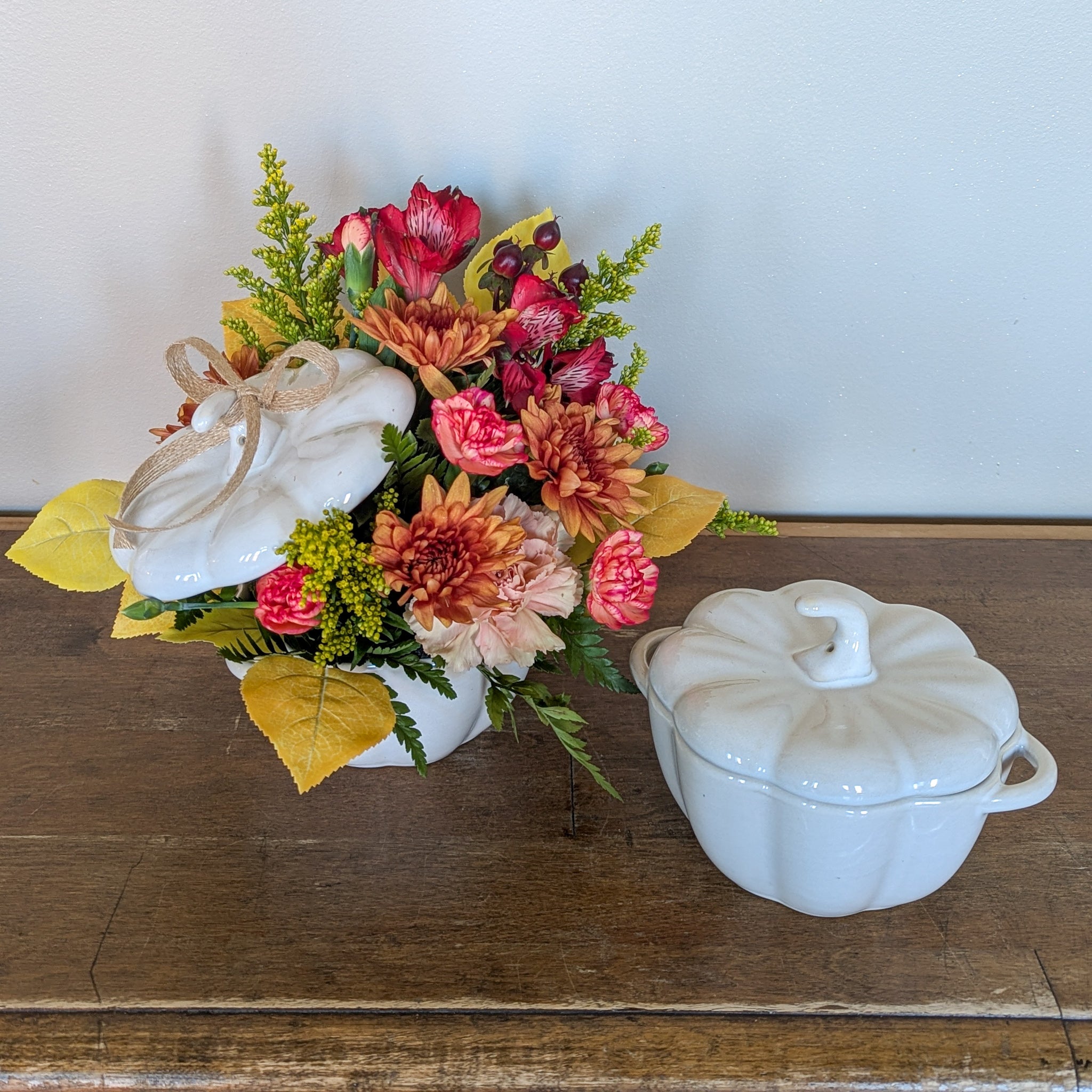 A fun keepsake gift! Our cream ceramic pumpkin crock is microwave, dishwasher and oven-safe and is overflowing with flowers in fall tones. Blooms will be a seasonal mix of our freshest selection and may include mums, carnations, daisies, alstroemeria and more. The crock is glazed and measured approximately 6.5" W x 4.5" H. This makes a lovely petite Thanksgiving centerpiece, unique hostess gift or fun birthday present!