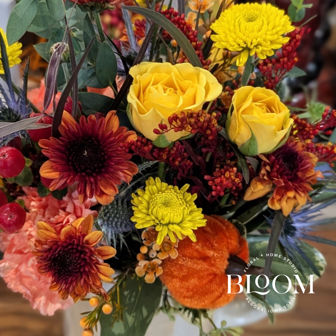 Our Pumpkin Spice Petals arrangement pairs the cozy charm of a coffee mug with the rich colors of autumn blooms. Warm, inviting, and perfectly seasonal, it’s like a cup of fall comfort—no latte required! Floral arrangement may include: lilies, mums, roses, berries, carnations, solidago, waxflower, faux florals and greens. We use only the freshest product so colors and flowers may vary according to availability.