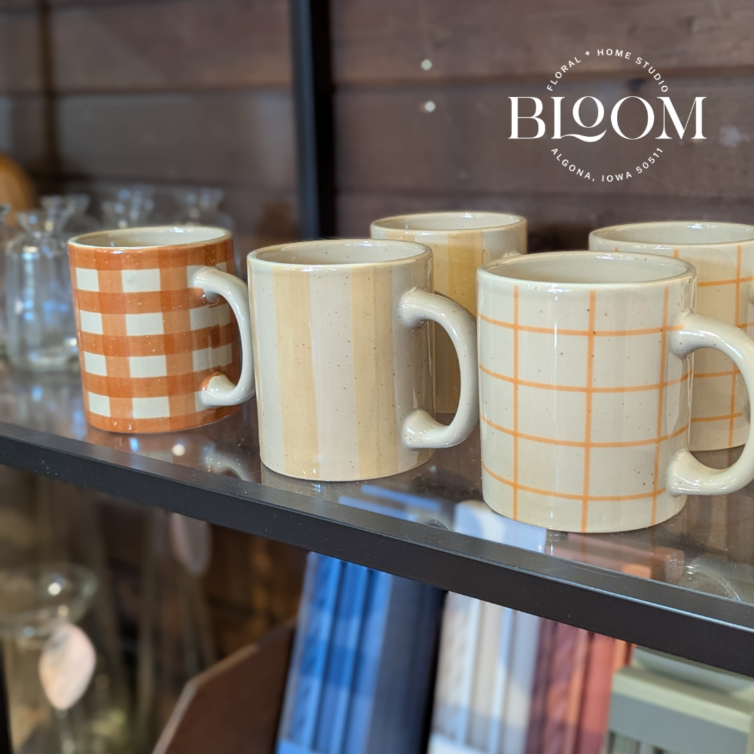 Mug comes in 3 styles chosen by the designers according to availability. size is 3.5" round hand painted stoneware - hand wash only